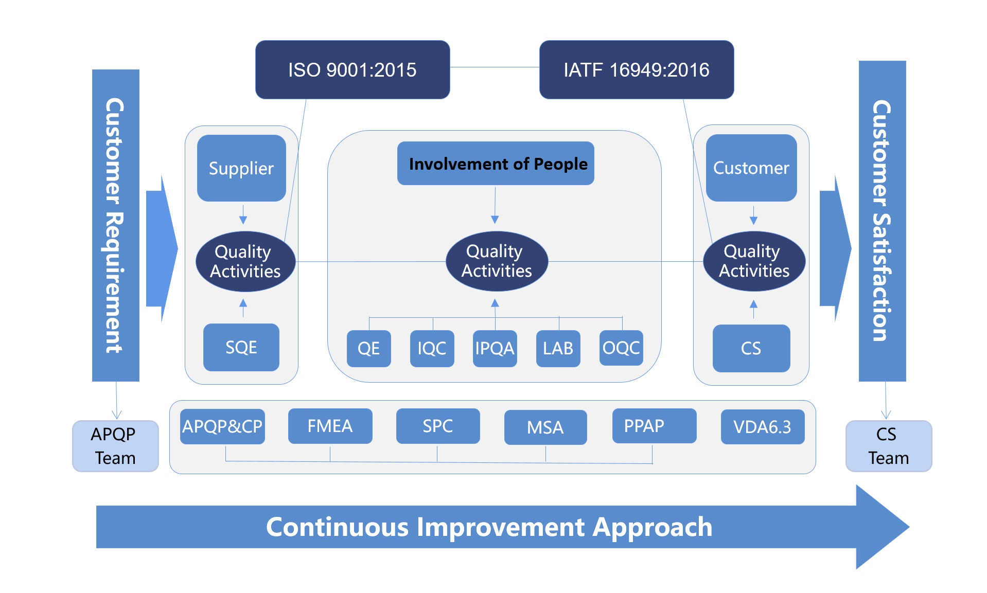 APQP는 제품의 초기 기획을 담당하여 고객의 모든 요구를 조작과 집행이 가능한 요구와 조치로 전환시킨다. 또한 집행부서에 대한 교육을 통해 고객의 요구를 추적하여 구체적으로 실현한다.